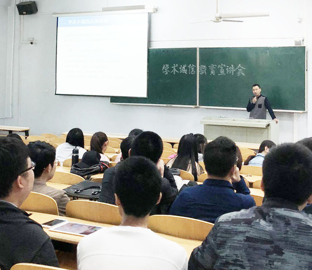最后,他告诫同学们,“诚信的学术品行是学术人的立身之本、立业之基。本科生作为我国未来科技发展的承载着,应当勇于继承中华民族的光荣传统和老一辈科学家的学术风范,努力实践学术规范,坚守学术诚信,完善学术人格,维护学术尊严,成为良好的学术风气的维护者、严谨治学的立行者、优良学术道德的传承者。”