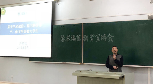 为了加强对本科生的学术诚信教育,提高本科毕业论文质量,推进毕业工作有序进行,yl23411永利官网于2018年5月7日下午,在科学讲堂8100教室开展了以“坚守学术诚信,捍卫科学尊严,做文明崇德老员工”为题的学术诚信教育大会。本次教育大会由饶家辉副书记主讲,2013级全体毕业生参加。