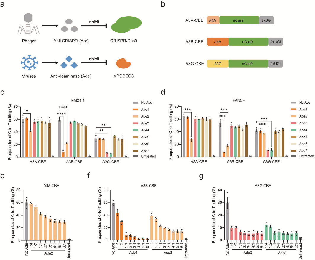 本研究基于针对四种病毒衍生的抗脱氨酶(Ades)的研究,证明其通过抑制APOBEC3催化域、将脱氨酶重新定位到核外区域或降解整个CBE复合物来拮抗CBE。通过设计脱氨酶结构域,其他常用的碱基编辑器,如CGBE,A&CBE,A&CGBE,rA1-CBE和ABE8e,可以被Ades适度抑制,扩大其应用范围。其次,研究发现基于微小RNA应答Ade载体的细胞类型,可特异性调控CBE-ON开关,表现其具有广泛的实用性。这些天然脱氨酶特异性ade是可以用来调节BEs基因组工程功能的工具。