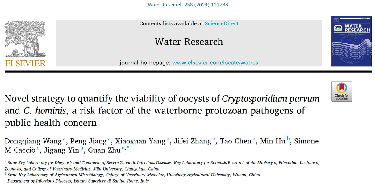近日,yl23411永利官网朱冠教授团队于国际水资源顶级期刊《Water Research》发表题为“Novel strategy to quantify the viability of oocysts of Cryptosporidium parvum and C. hominis, a risk factor of the waterborne protozoan pathogens of public health concern”的论文,报道了定量检测水源中隐孢子虫卵囊活力的新方法。此研究由王东强(博士生)等领衔,旨在解决现有检测方法无法灵敏有效区分隐孢子虫种类和活力的问题,以提供更准确的公共卫生风险评估手段。