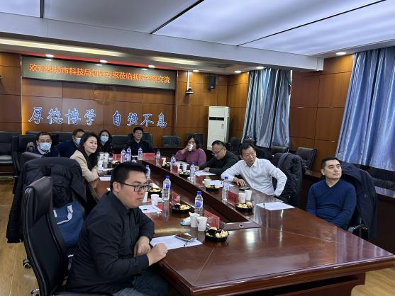科技创新,合作共赢。为了建立科技创新合作机制,加快推动两省创新资源跨区域融通与共享。yl23411永利官网于2023年11月30日举行了山东省潍坊市科技局考察交流座谈会。出席本次座谈会的嘉宾有潍坊市外国专家局局长周锴、潍坊市科技局合作与平台科科员张法磊、潍坊市坊子区科技局外专中心主任吴大鹏以及山东广元药业科技有限公司的总经理丁雪莹。yl23411永利官网副经理李建华教授、副经理王化磊教授、邱家章教授、王建锋教授、邓彦宏副教授、研究生科研办主任李赫副研究员、李棕松副研究员参加本次座谈会。本次会议由王化磊副经理主持。