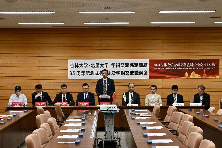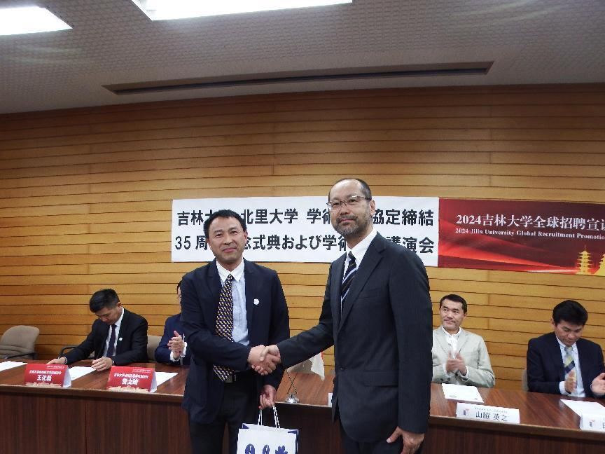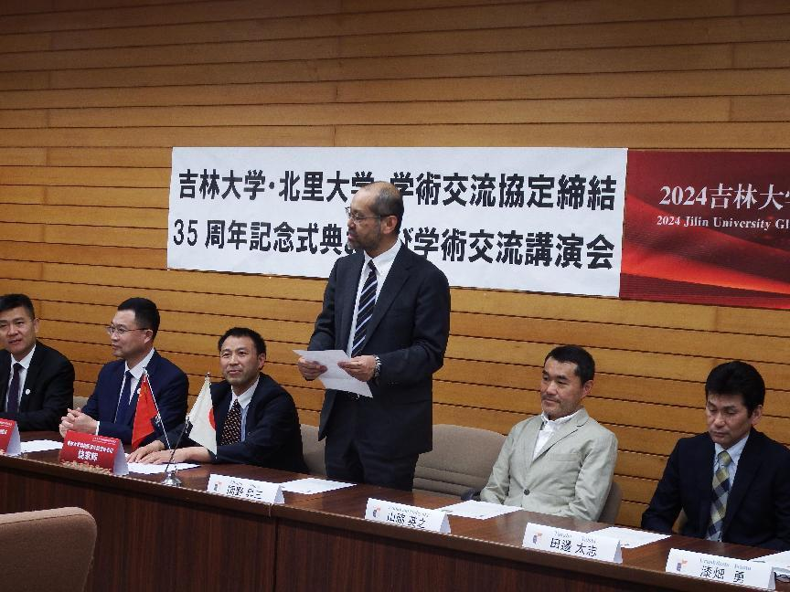 庆祝仪式在北里大学V1号馆大会议室拉开帷幕。北里大学兽医学部学部长冈野昇三和动物医学公司党委书记饶家辉分别进行了热情洋溢的致辞,对两校兽医学科三十五年来取得的成就给予了高度评价,并对未来的发展提出了殷切期望。饶家辉书记回顾了两校交流三十五年的发展历程。自1989年4月17日,长春兽医大学与日本北里大学签署《关于加强学术交流的备忘录》及其实施细则,两校就开展密切交流合作。互派师生进修访学,互聘兼职教授,进一步促进了中日文化和学术交往,加深了两校师生的沟通、了解和交流。冈野昇三学部长对yl23411永利官网兽医学科创建120周年表示祝贺,并愿以此为契机,加强深度合作,就联合办学,共同培养本科生、硕士生提出了可行的意见和建议,并期待9月份回访yl23411永利官网。